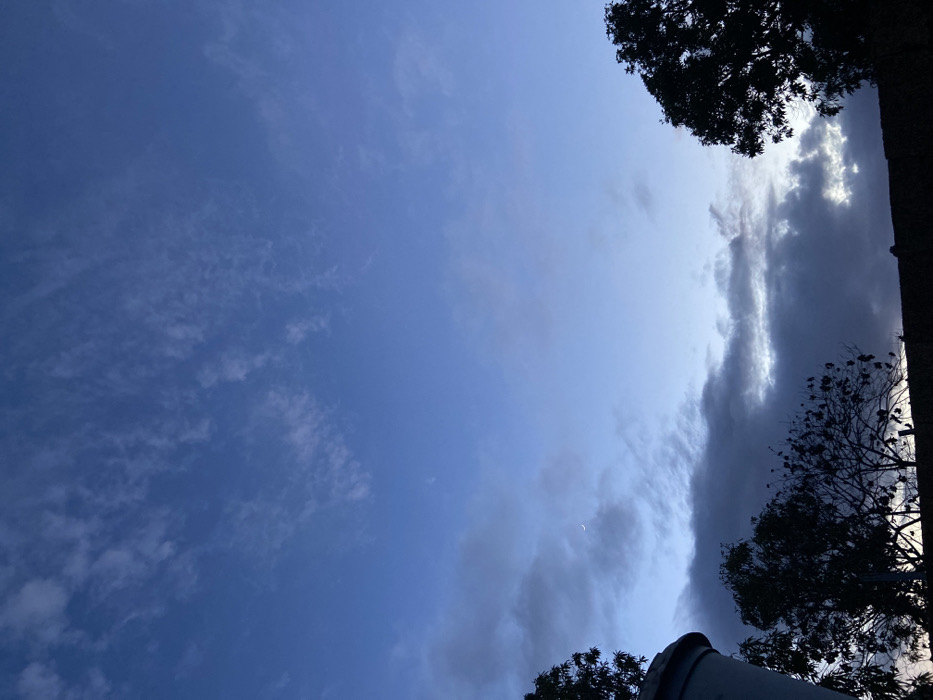 A low-angle view of a sky transitioning from blue to gray. Thin wispy clouds are scattered across the clear blue portion on the left. Heavier, darker clouds dominate the right, with glimpses of sunlight peeking through. Silhouetted trees and a cylindrical object frame the edges. A faint crescent moon is visible amidst the clouds.