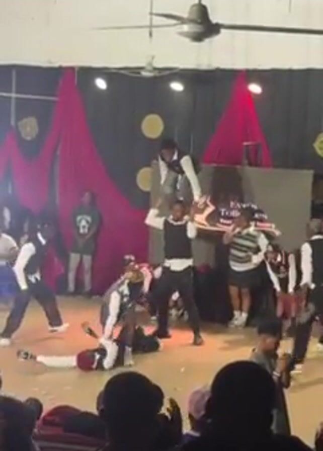 A group of young people are performing a dance on a stage in front of a seated audience. They are dressed in school uniforms, including vests. There are two men standing, holding a third man on their shoulders, who is then thrown off to perform a flip. There is a black and white sign behind the performers. The walls are light-colored, and there are large drapes of red and black. There is a ceiling fan. Someone in the audience is recording with a camera.