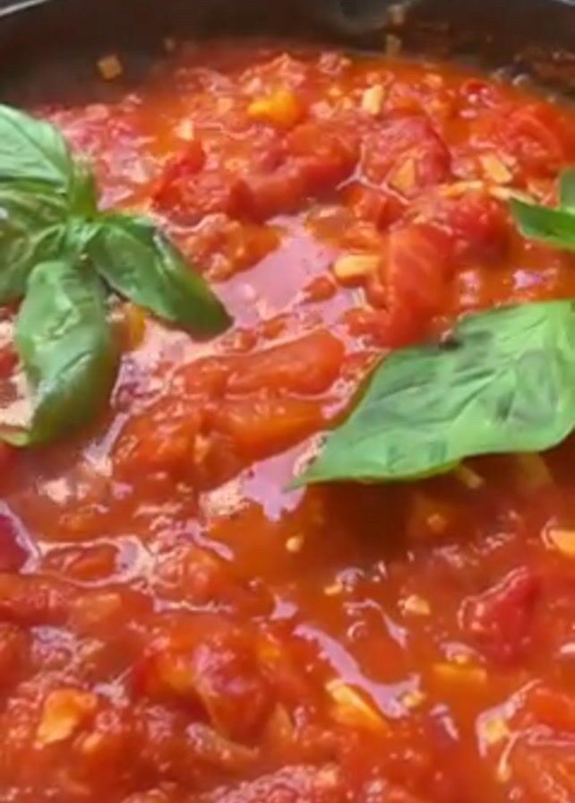 A close-up shot shows a cast-iron skillet on a gas stove, filled with simmering tomato sauce