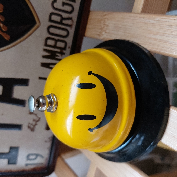 A yellow bell with a smiley face design sits on a black base