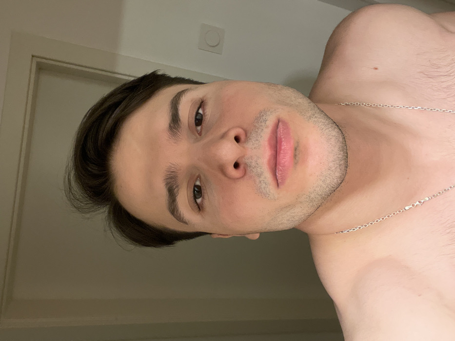 A shirtless man with dark hair and brown eyes looks into the camera. He wears a silver chain around his neck. The background includes a white wall and a doorframe. The lighting is soft, creating subtle shadows on his face. His expression is neutral. He has light stubble on his face.