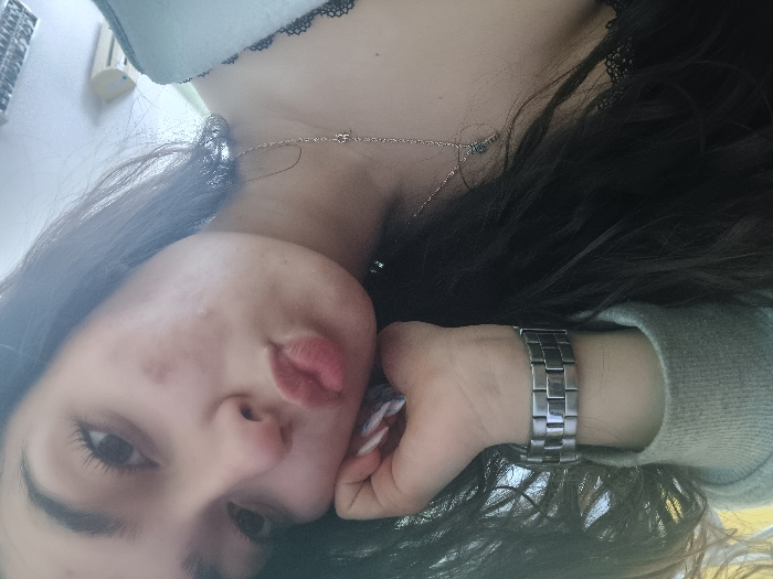 A female individual is depicted in a close-up, angled selfie taken indoors in Gorna Oryahovitsa, Bulgaria. She has long, dark hair, visible on the right side of the frame. Her head is tilted, resting on her right hand, and her lips are pursed in a "kiss" pose as she looks directly at the camera. Her left wrist bears a silver-colored metal link bracelet or watch. A thin silver-colored chain necklace with a small pendant, possibly a letter 'H', hangs around her neck. She is wearing a light-colored long-sleeved garment on her left arm and a dark garment with black lace trim on her upper chest. Her fingernails are manicured with a light, possibly glittered polish. The out-of-focus background reveals a white ceiling with a rectangular fluorescent light fixture and an off-white wall-mounted air conditioning unit on the upper right.