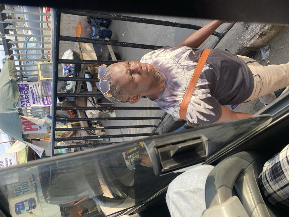 A street scene captured from inside a vehicle. A man with sunglasses perched on his head stands outside, wearing a patterned shirt and tan pants with a brown strap across his chest. Behind him, a metal fence lines the sidewalk where a vendor displays "ATM CARD" signs and other items under a green umbrella. A person is also sitting on the floor. The vehicle's interior shows the dashboard, seats, and a glimpse of a plaid-patterned fabric. The image is slightly distorted and the perspective tilted.