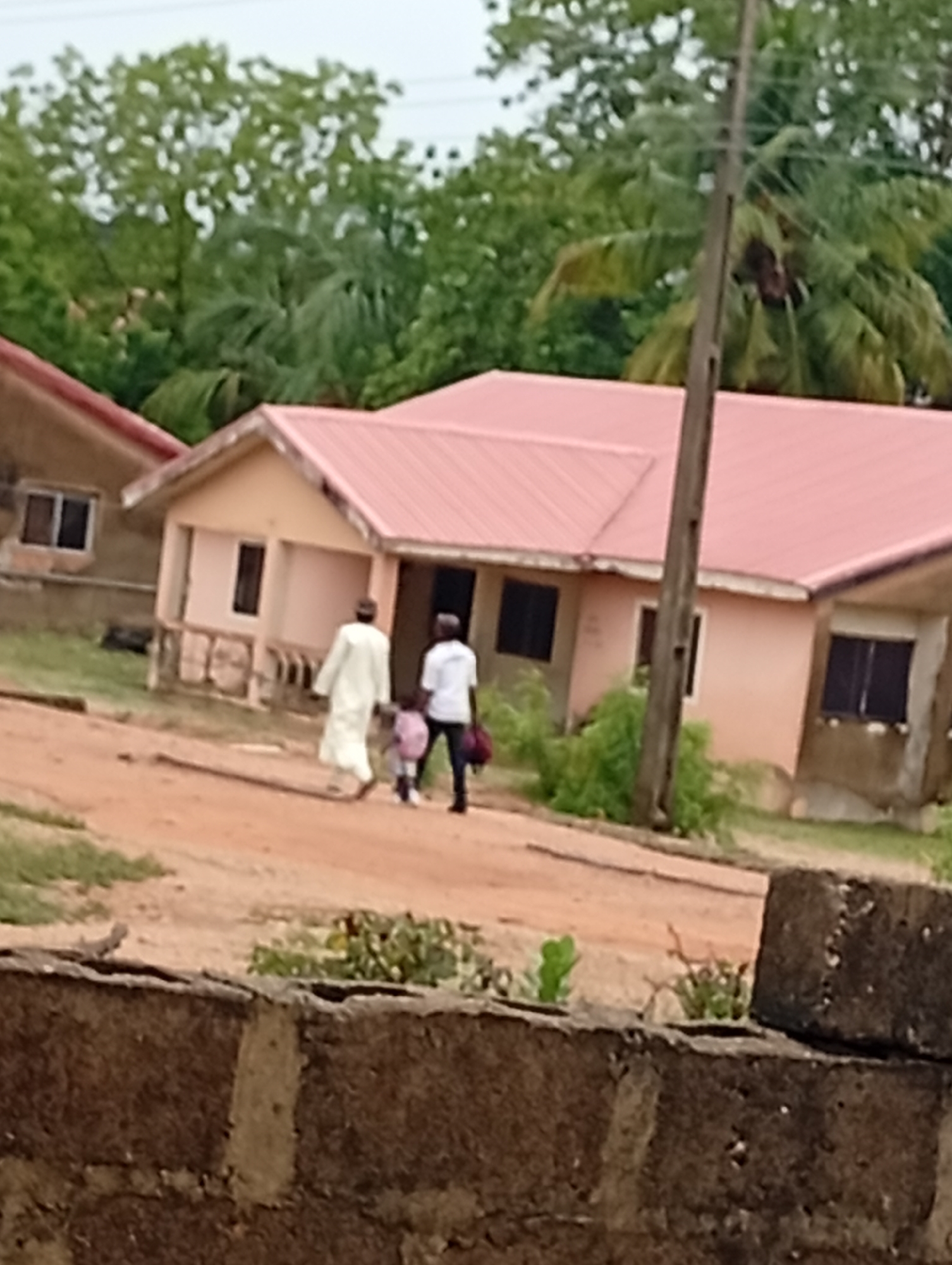 The image depicts a scene in Adankolo, Nigeria. In the mid-ground, three figures, presumably two adults and a child, are walking away from the viewer along a dirt road. One adult wears a long, white garment. The second adult is dressed in a white shirt and dark pants, carrying a dark bag. The child walks between them. Behind the figures are two single-story residential buildings with pink roofs and light-colored walls. There is an utility pole situated between the two buildings, slightly right of center, and green foliage visible in the background. In the foreground, a low wall constructed of dark-colored, roughly textured bricks is present.