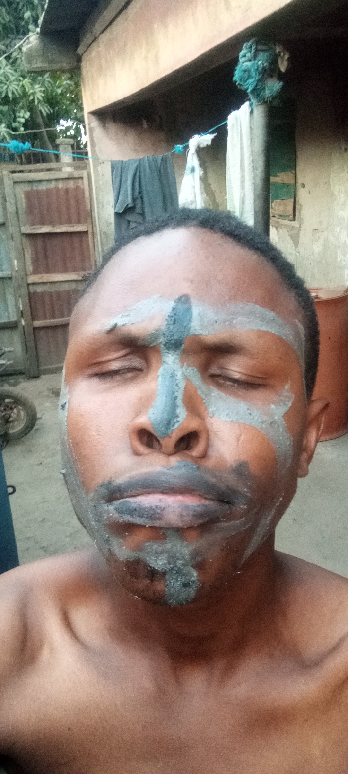 A dark-skinned individual, appearing to be an adult male, is centered in a vertical composition, shown from the chest up with closed eyes. The subject's face is partially covered with a granular, greenish-grey substance, applied in distinct patterns: a horizontal stripe across the forehead, a vertical stripe down the nose extending to the upper lip, and irregular patches on the cheeks and chin. The lips are also coated with the substance. The subject is shirtless, revealing the collarbones and upper chest. In the background, consistent with a location in Sabon Tasha, Nigeria, a light-colored building structure with an overhang is visible. A blue cord, functioning as a clothesline, is strung horizontally across the upper frame, from which dark and white fabrics hang. To the left, a wooden or corrugated metal gate is visible, with green foliage behind it and a partial view of a wheel on the ground. To the right, a reddish-brown barrel or container is partially visible against a light wall, and a weathered green-painted structure is present under the building's overhang.