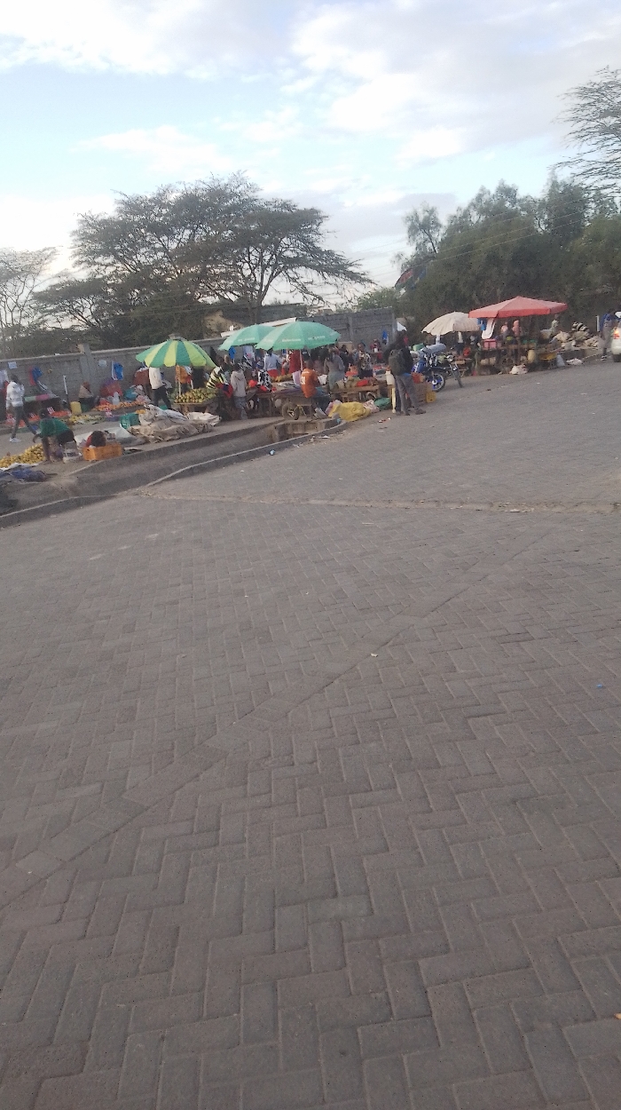 An outdoor market scene unfolds under a bright sky. Vendors display goods beneath a row of umbrellas. People mill about, some appearing to be customers. A paved area occupies much of the foreground, leading up to the market area. Trees stand in the background, adding a touch of nature to the commercial setting. A motorcycle is visible near the market stalls.