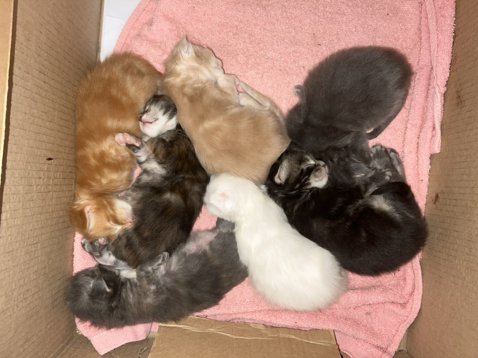 - "This image depicts eight neonatal kittens resting within a brown corrugated cardboard box, lined with a pink terrycloth towel" by FM-Ke9ym1, licensed under CC BY 4.0