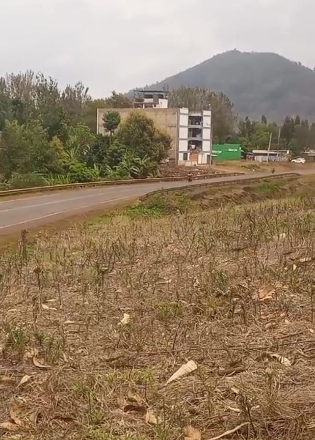 view of a road running through a rural area. On one side of the road is a dry field, while on the other side is a building under construction surrounded by trees. In the distance, a hill or mountain can be seen under a cloudy sky. There is a person walking on the road in the direction of the viewer.