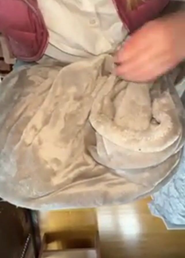 person sitting with a blanket on their lap. They lift the blanket to reveal a Sphynx cat curled up between their legs. The person is wearing blue jeans. The cat is hairless and appears pinkish. The scene is indoors with wooden flooring.