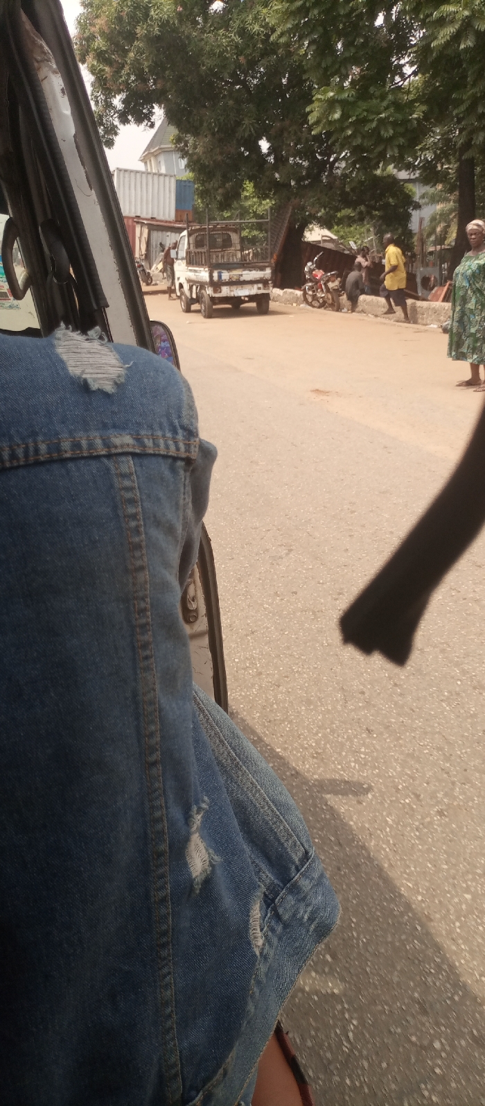 The image depicts a street scene in Ogbunike, Nigeria, viewed from the interior of a moving or stationary vehicle. In the immediate foreground, the lower half of an individual's body is visible, wearing blue distressed denim jeans with rips on the left thigh and knee, and a glimpse of red/maroon footwear. A dark shadow, possibly from another limb, extends onto the road from the lower right. The road ahead is paved with a light-colored, aggregate-speckled surface, appearing to be asphalt or concrete, with a small dark stain in the center-midground. A low concrete curb or wall lines the right side of the road, separating it from a dirt shoulder. On the left side of the road, a white, compact pickup truck with a rear metal cargo rack is parked, facing away from the viewer. Behind it, a person in dark attire is partially visible near the vehicle. Further left and behind, two white cargo containers are stacked, with a light-colored building featuring a grey pyramidal roof visible above them. Interspersed are dense green trees providing overhead canopy. Along the right side of the road, near the curb, multiple motorcycles are parked. Several individuals are present: one person in a bright yellow shirt stands facing right near the motorcycles, another in dark clothing sits on the low concrete wall, and on the far right, an older woman in a patterned green and yellow dress stands facing slightly left, looking towards the camera. The overall environment suggests a bustling urban or semi-urban setting with commercial activity.