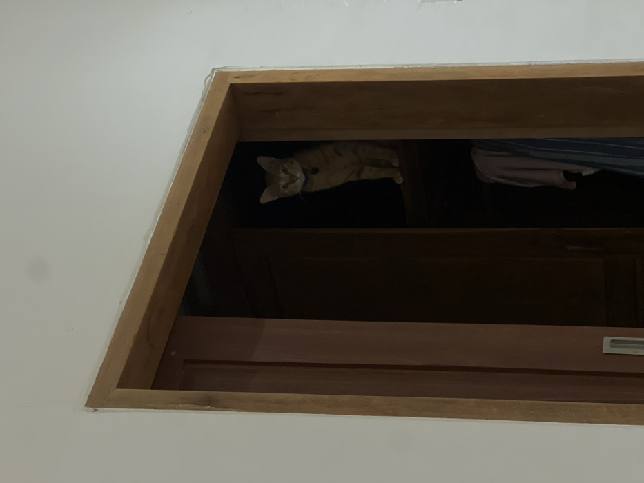 The image depicts an indoor scene in Munggu, Indonesia. An orange tabby cat, wearing a dark collar, stands erect on a shelf or ledge within a dark interior opening. The cat faces forward, looking directly towards the viewer. This opening is framed by light brown wooden trim, adjacent to a partially visible dark wooden door on the left. Below the cat, within the dim interior, hanging clothing items, specifically a light-colored shirt and blue striped fabric, are discernible. The surrounding wall material is white, indicating an interior room or hallway. The scene is characterized by a significant contrast between the brighter ambient light in the foreground and the poorly lit interior space.
