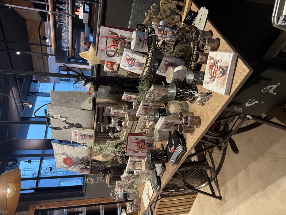 A table displays a collection of rustic-themed home decor. There are mugs, napkins, and dish towels with stag and deer designs. Decorative candle holders, napkin rings, and small silver stag figurines are scattered around. Grey felt tote bags and a canvas pillow with a crab print add texture. The display sits on a bicycle frame, with the wheels visible, giving it a vintage touch.