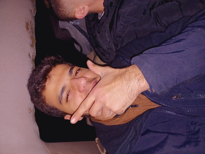 A man with short dark hair smiles as another person's hand covers his mouth. The man is wearing a brown collared shirt with a dark jacket over it. The other person, with short hair, is wearing a black jacket. Both appear to be indoors, with a beige wall visible in the background.