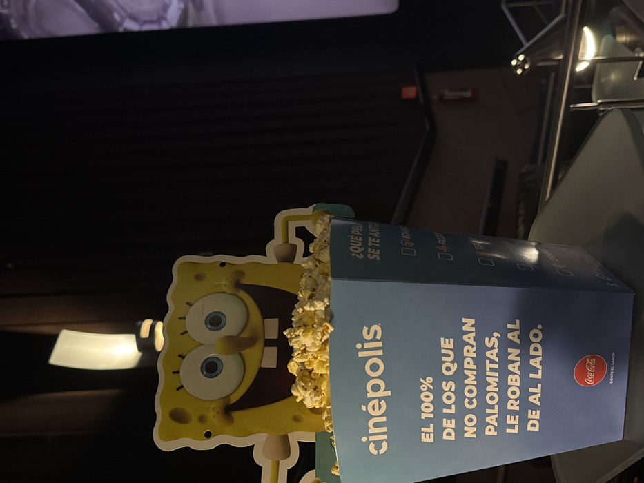 A bucket of popcorn from Cinépolis features a Spongebob cutout attached to the front
