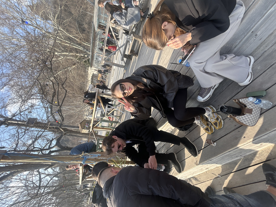 The image captures an outdoor social gathering on a multi-level wooden terrace, likely located within or adjacent to the Sea Garden (Morska Gradina) in Varna, Bulgaria. The scene is illuminated by bright daylight under a clear sky, with bare deciduous trees indicating a late winter or early spring season. In the foreground, four individuals are seated on wooden steps. On the far left, a male in a black puffer jacket is partially visible from behind. He is interacting with a male seated to his right, who wears a black zip-up jacket, black pants, and dark loafers, with sunglasses on his head, looking downwards. To the right of him, a female wearing a black leather jacket, black leggings, and dark sunglasses poses for the camera with a peace sign using her right hand. Adjacent to her on the wooden platform are a Gucci-branded handbag, a black insulated bottle, and a clear plastic water bottle. On the far right, a female with reddish-brown hair, dressed in a black top and light grey wide-leg pants, is intently focused on a white smartphone held in both hands. A white plastic cup with a straw and a blue plastic cup are positioned nearby. The midground and background feature multiple other individuals populating the expansive outdoor space, seated at various wooden tables and benches, engaged in social interactions. The environment incorporates wooden railings, platforms, and a prominent wooden pole wrapped with blue rope. String lights with colored bulbs are strung between the bare tree branches, and a small wooden birdhouse-like object rests on a railing. In the distant background, structures resembling greenhouses are visible, backed by a tree-covered hillside.