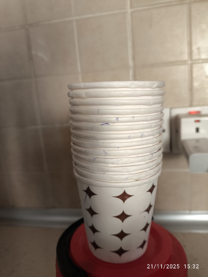 The image displays an indoor scene, located in North Nicosia, Northern Cyprus / Cyprus. The central focus is a vertical stack of approximately fifteen white disposable paper cups, each featuring a repeating pattern of dark brown, four-pointed star shapes on its lower section. Faint blue ink marks are visible on the upper rims and sides of several cups within the stack. The cups are resting on a red, circular object, which includes a black perimeter, situated on a light-colored countertop. A metallic trim runs along the junction between the countertop and the background wall. The wall is surfaced with light beige, square tiles, arranged in a grid pattern with light grout lines. To the right of the stacked cups, a white electrical wall outlet or a device plugged into it is partially visible; it exhibits an illuminated red indicator light and a connected white adapter. The environment is evenly lit. No individuals are present, and no actions or interactions are depicted. A digital timestamp in the lower right corner indicates "21/11/2025 15:32".
