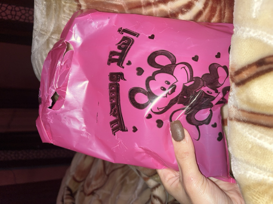 A pink plastic bag with a cartoon of Mickey Mouse is held by a hand with a dark brown nail
