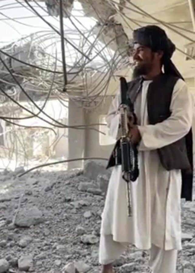 man standing in a debris-filled area, likely a building that has been destroyed or severely damaged. The man is wearing traditional clothing, including a white shalwar kameez, a dark vest, and a turban. He is holding a rifle and smiling. The background is filled with rubble, twisted metal, and wires, indicating significant structural damage. The overall impression is that the scene depicts the aftermath of a conflict or disaster.