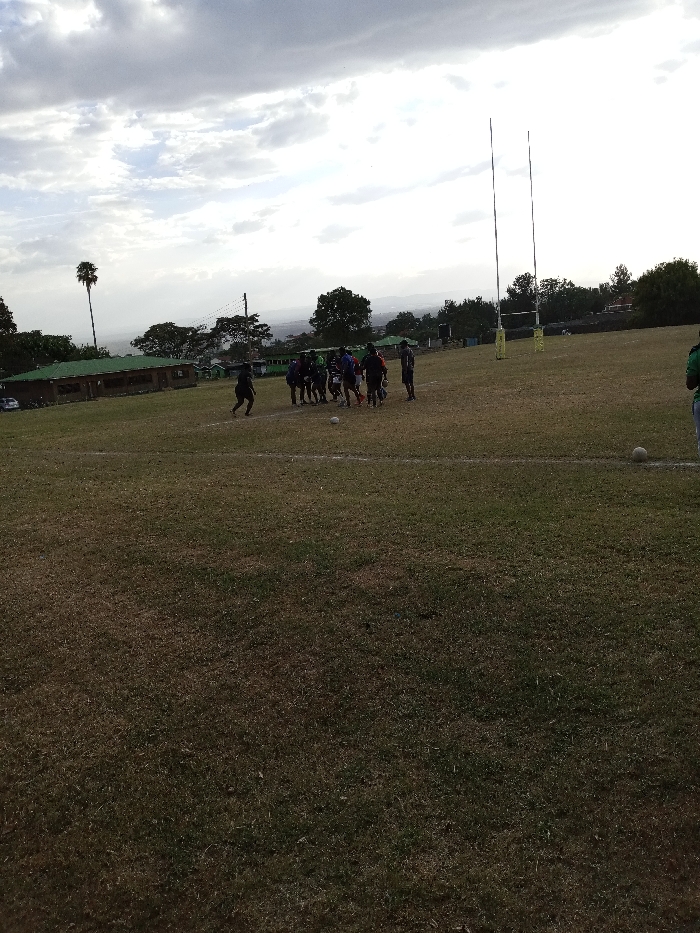 A group of people are playing rugby on a field of dry grass, with a rugby ball visible near the scrum. In the background, there are rugby goalposts, trees, and buildings under a cloudy sky. A lone palm tree stands out against the horizon. A second rugby ball is seen near the right of the image.
