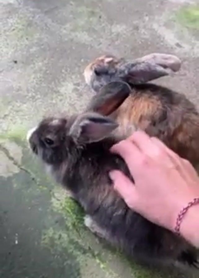 A video shows a pair of rabbits sitting on a concrete surface