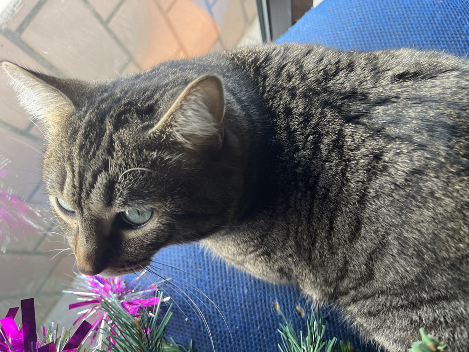 A domestic cat with tabby markings and light blue-green eyes is depicted in a close-up, upward-angled shot. The cat's head is tilted to its left, and its gaze is directed towards the upper left quadrant of the frame, specifically at a piece of artificial green pine foliage intermingled with bright pink tinsel. The cat's prominent whiskers are visible, extending forward. The animal's fur exhibits a pattern of dark brown and lighter greyish-brown stripes. It is positioned on a dark blue, textured fabric surface, possibly upholstery. The background is softly blurred but indicates an indoor setting with ambient light creating highlights on the cat's fur, particularly on its right side. The location within Bragança, Portugal, is not discernible from the image data.