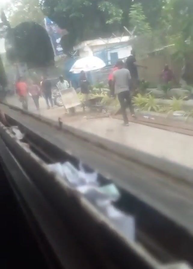 From a moving vehicle, the camera captures a street scene. Several people, some wearing red and yellow shirts, are walking and standing around. Some of them are carrying wheelbarrows, and there are tires on the ground. The environment appears to be a construction or work site, with a building and trees visible in the background.