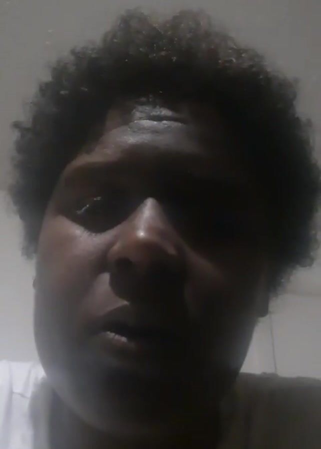 A close-up, dimly lit video shows a person with dark skin and short, curly dark hair. The individual is wearing a white t-shirt and looking directly into the camera with a serious expression. The background appears to be a plain, light-colored wall.