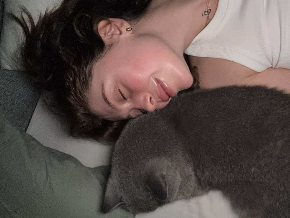 A woman with dark, curly hair and fair skin is lying on her side, eyes closed, and smiling gently. She wears a white top and a delicate necklace. A gray cat is curled up against her chest, seemingly asleep as well. They both rest on a bed with neutral-toned sheets and pillowcases. The scene appears peaceful and intimate.
