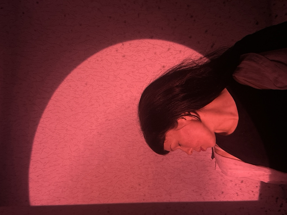 An adult female subject is observed in profile, facing left, against a textured wall bathed in reddish-pink light. Her eyes are closed or downcast, and she has dark, straight hair with bangs covering her forehead. She is attired in a dark top, with a lighter-colored garment draped over her left shoulder. The reddish-pink illumination casts a distinct arc-shaped light pattern onto the textured wall surface behind and above her. No specific identifiers for a location within Chaikovsky, Russia, are present in the image.