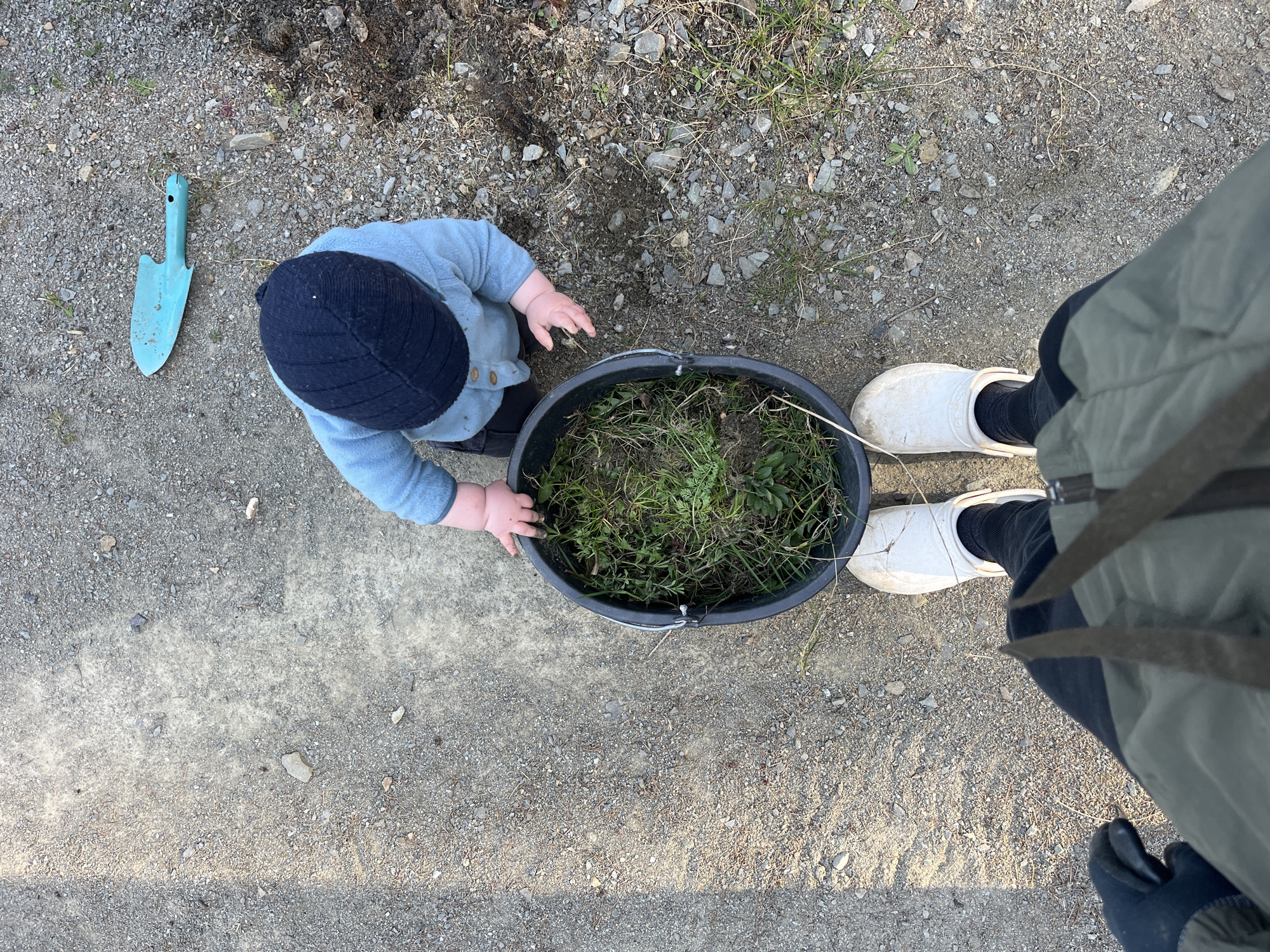 The scene depicts an overhead view of an outdoor activity in Gangloff, Germany. A child, dressed in a light blue long-sleeved top, dark pants, and a dark blue knitted cap, is positioned on their knees or bending forward. Their hands are placed on the rim of a black plastic bucket, which is filled with green vegetation, primarily grass and weeds, mixed with some soil. To the upper right of the child, a teal-colored small gardening shovel lies flat on the gravel ground. The adult taking the photo is partially visible in the foreground, with their feet and lower torso in the frame. The adult wears black pants, white Crocs over black socks, and an olive-green jacket. A black glove is visible on the adult's left hand, which is held loosely by their side. The ground consists of a light gray gravel path or area with scattered larger stones, patches of exposed dirt, and sparse green plant growth. Sunlight illuminates the scene, casting subtle shadows, particularly on the left side of the frame. The interaction involves the child engaging with the bucket of plant material, seemingly under the observation or participation of the adult.