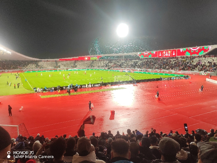 A brightly lit soccer stadium is packed with spectators. A soccer game is in progress on a green field, surrounded by a red track. Large LED displays decorate the upper sections of the stadium. People are seated in the foreground, watching the match, some holding up phones to record. The stadium lights illuminate the field and the surrounding area. A bright light in the night sky is visible above the stadium.