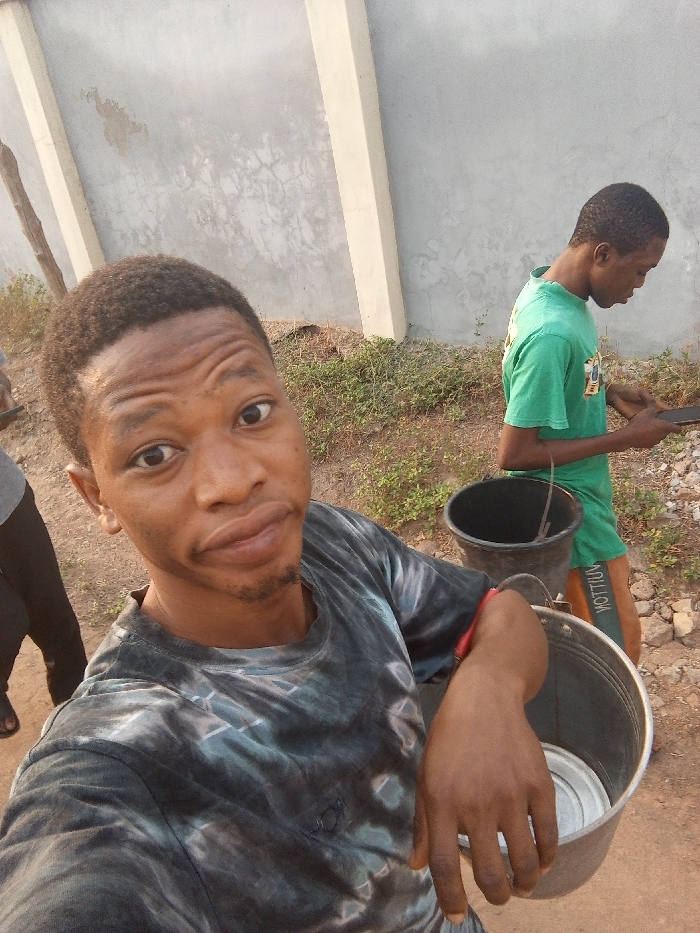 Two men stand outdoors. One, in the foreground, holds a metal bucket. He wears a black t-shirt and faces the camera with a neutral expression. Behind him, another man in a green t-shirt looks down at a phone in his hands. Each man stands near a black bucket. Behind them, short green plants grow near a concrete wall. The ground is dirt.