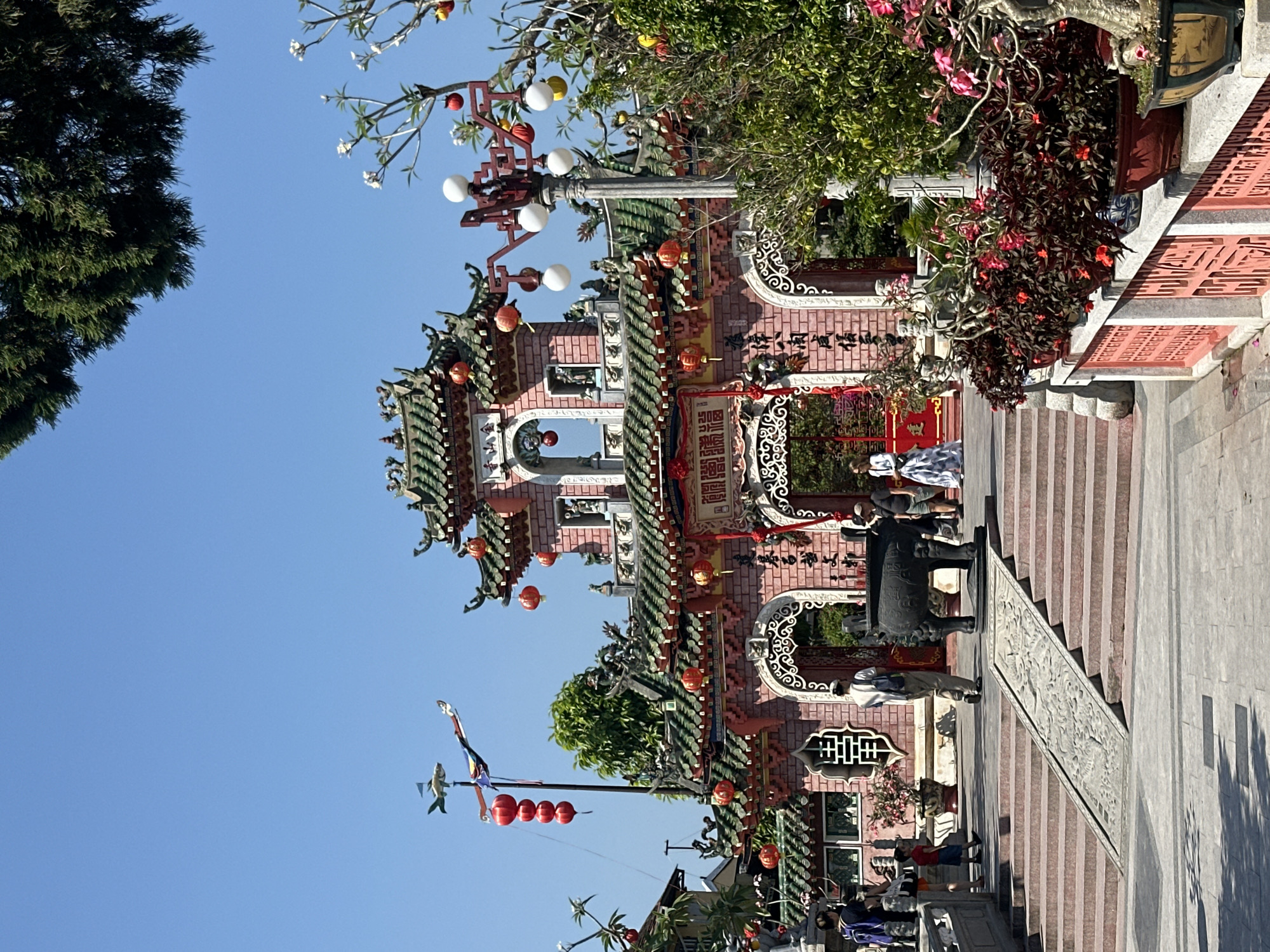 n ornate, red brick and green tiled pagoda-style structure in Hội An Ward, Vietnam. The structure is adorned with red lanterns and elaborate carvings. People are seen walking on the steps leading towards it. A stone carving is set on the steps. Trees and foliage flank the building. A clear blue sky is overhead.