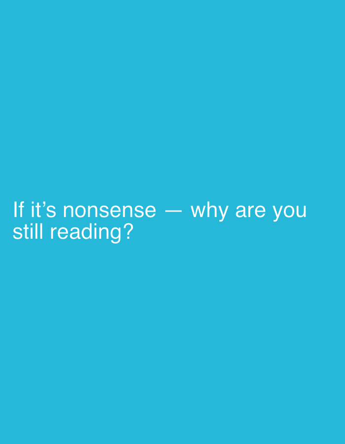 A vibrant, light blue background serves as the canvas for a playful, self-aware question posed in white text. The query, "If it's nonsense — why are you still reading?" directly addresses the viewer, adding a touch of humor and engaging the audience in a metatextual experience. The words are arranged in a simple, clean font, emphasizing the message's directness and provoking a moment of contemplation.