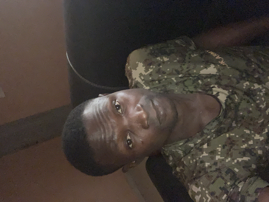 An adult male subject is depicted in a close-up, self-portrait style photograph, situated in an unspecified indoor location within Kado, Nigeria. The subject, who has dark skin and short dark hair, is wearing a short-sleeved digital camouflage t-shirt with the text "JK ARMY" visible on the right chest area. A faint mark or scar is present on his left cheek. He is looking directly at the camera with a neutral expression. The background is dimly lit and indistinct, showing a dark, possibly upholstered, surface to the subject's right and light brown or tan walls.