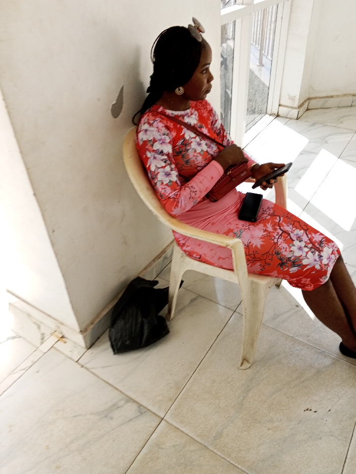 An adult female is seated on an off-white plastic chair against a plain white wall in an indoor or semi-indoor setting in Lokoja, Nigeria