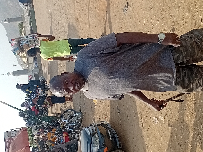 A man stands in a busy outdoor area with motorbikes and other people in the background. He is wearing a grey t-shirt, camouflage pants, and a watch. He holds a decorative stick in his right hand. In the background, a person carries items on their head, and buildings with prominent towers are visible. The ground appears sandy or dusty.