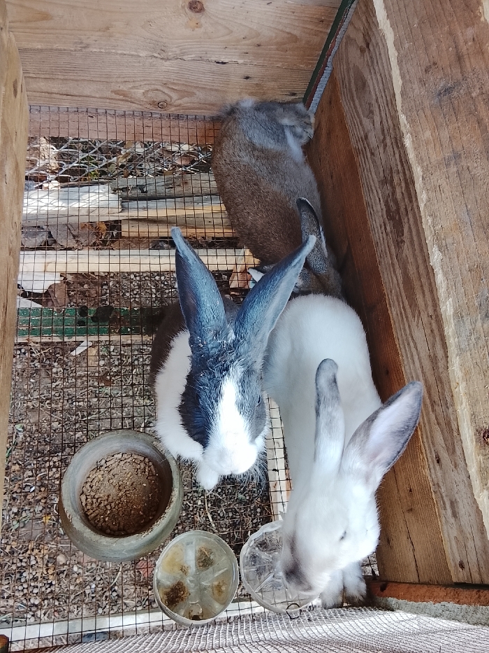 - "The image captures four rabbits within a wooden hutch featuring a wire mesh floor, viewed from an elevated perspective" by FM-FtvzI3, licensed under CC BY 4.0
