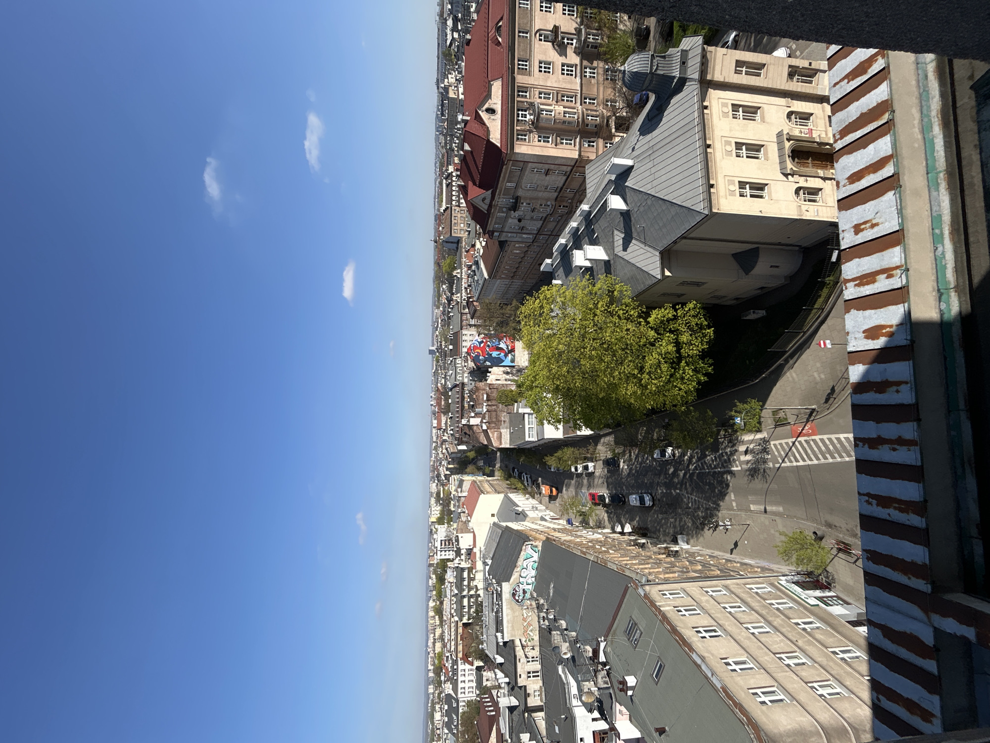 The image captures an elevated view of Krakow, Poland, showing a cityscape under a clear blue sky with scattered clouds. The perspective suggests the photograph was taken from a high vantage point within the city. The cityscape features a mix of architectural styles, including buildings with red tile roofs, apartments with rows of windows, and structures with gray or light-colored facades. A prominent green tree sits near the foreground, adding a touch of nature to the urban environment. The streets below are visible, with cars and pedestrians navigating the pathways. The overall atmosphere suggests a sunny day in the city. In the distance, more buildings and structures appear, fading slightly into the horizon, indicating the expanse of Krakow.