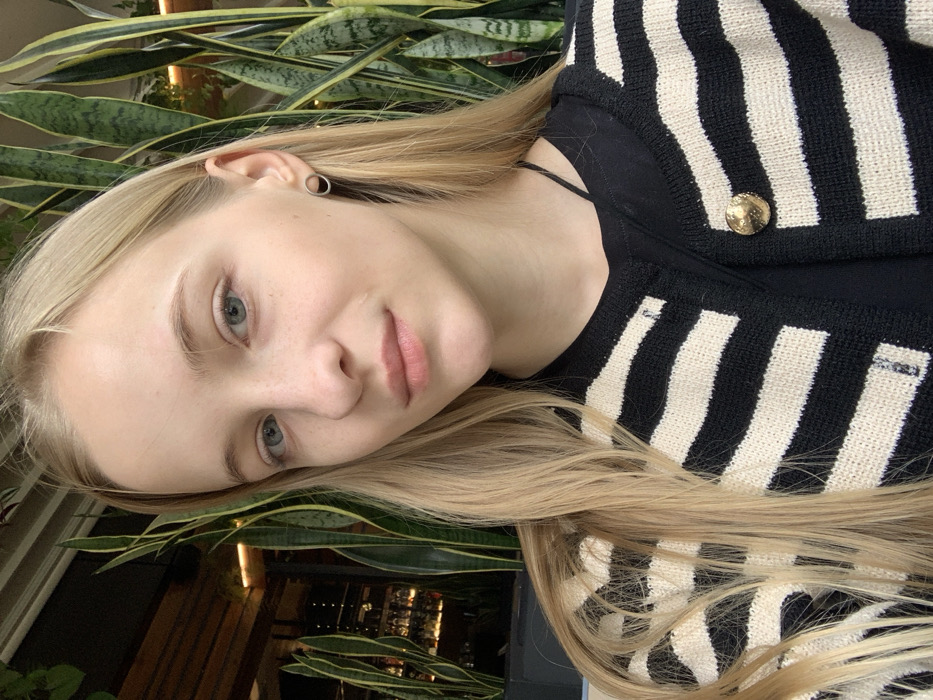 The image depicts a close-up portrait of a young, light-skinned female individual. Her long, straight, blonde hair is parted and falls over her shoulders. She has blue eyes, light eyebrows, and freckles across her nose and cheeks. A subtle scar is visible on her left cheek, and a small, circular, silver-toned stud earring is present in her right earlobe. She wears a black and off-white horizontally striped cardigan open over a black top, with a single large, textured, gold-toned button located on the right side of the cardigan's opening. A thin black strap is visible near her left clavicle. Her gaze is directed forward towards the camera. The background indicates an indoor setting, identified as a restaurant or cafe in Odesa, Ukraine. Tall, green and yellow-striped Sansevieria trifasciata (snake plants) are arranged in the mid-ground. Behind the plants, a dimly lit area features a bar structure with bottles and glassware visible on shelves, illuminated by warm artificial light. A dark wooden beam is present in the upper left background.