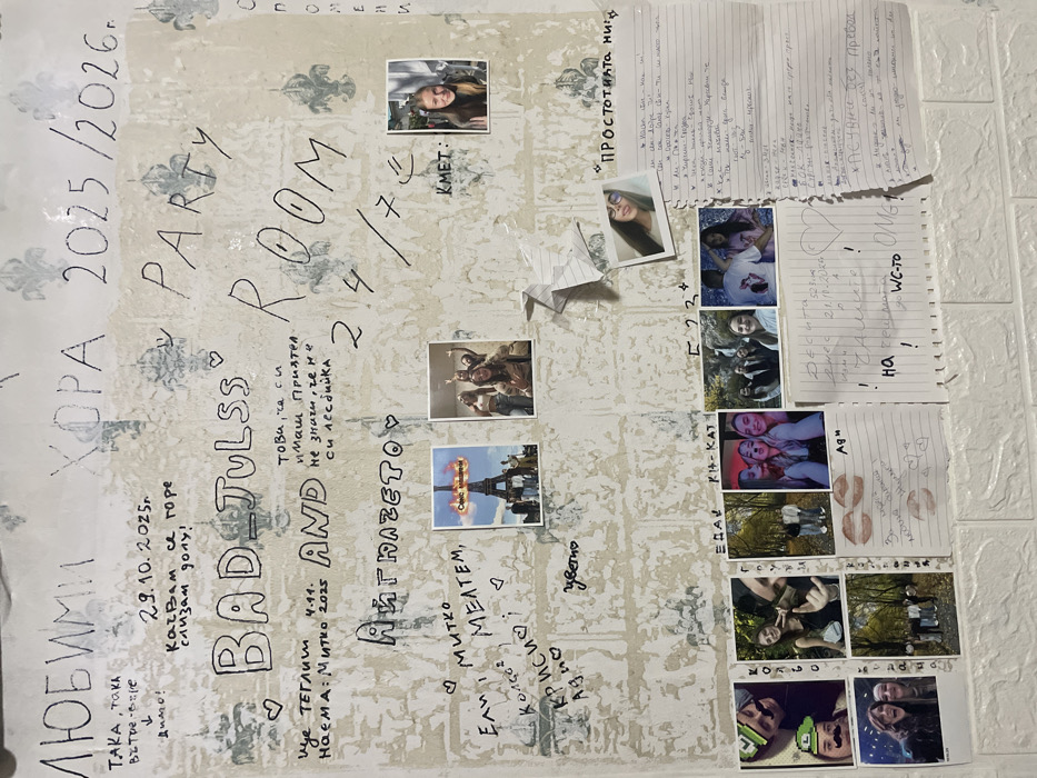 This scene is located on a wall in a building in Plovdiv, Bulgaria. The image displays an indoor wall surface, primarily covered with heavily textured, peeling white wallpaper featuring faint, repeating light blue fleur-de-lis patterns. The bottom portion of the wall transitions to a white, horizontally aligned brick-patterned wallpaper. The wall serves as an informal message board, densely covered with handwritten text in black marker, photographs, and notes on lined paper. Dominant handwritten text in Cyrillic and Latin scripts includes "ЛЮБИМИ ХОРА 2025/2026", "PARTY ROOM 24/7", "BAD_JULSS", "AND", and "ИГНАЗЕТО". Other inscriptions include names such as "Митко", "Ели", "МЕЛТЕМ", "КРИСИ", "Ади", "Увето", "КИ-КАТ", "ЕДА", "СВЕТО", "КОЛЕ", "ГЪЛУБ", along with dates like "29.10.2025", "4.11.", and "21.10.2023". Some phrases in Bulgarian, such as "ТОВА, ТА СИ ИМАШ ПРИЯТЕЛ", "НЕ ЗНАЧИ, ЧЕ НЕ СИ ЛЕСБИЙКА", "ПРОСТОТАТА НИ!", and "ХАСУЛЯЦИ БЕЗ ПРАВА", are also visible. A handwritten label "КМЕТ:" (Mayor:) precedes a photograph. Multiple small photographs are affixed to the wall. These primarily feature young individuals, often in groups, smiling and posing in various social settings, both indoors and outdoors. Specific photographs include: * A small image depicting the Eiffel Tower on fire, with accompanying text. * A group of four young women smiling and posing indoors. * A close-up portrait of a young woman with long brown hair, smiling directly at the camera. * Another portrait of a young woman with glasses. * Two vertically stacked portraits: one of a man with a drawn-on mustache and a green cap, and another of a woman smiling with a partially visible second person. * A photo of a young woman making a peace sign, and below it, two men and two women in an autumnal outdoor setting. * A photo of two people in an outdoor setting with trees. * Three young women smiling, taking a selfie in a dimly lit room with red lighting. * Four young women posing together in an indoor setting. * A person seen from behind wearing a white t-shirt with a graphic, next to a young woman. Several pieces of lined paper are taped to the wall, containing additional handwritten messages in Bulgarian. One note features three distinct red lipstick kiss marks. A crumpled piece of paper is also attached centrally on the wall. The collective arrangement of items suggests a personal, commemorative display, likely reflecting shared experiences and friendships.