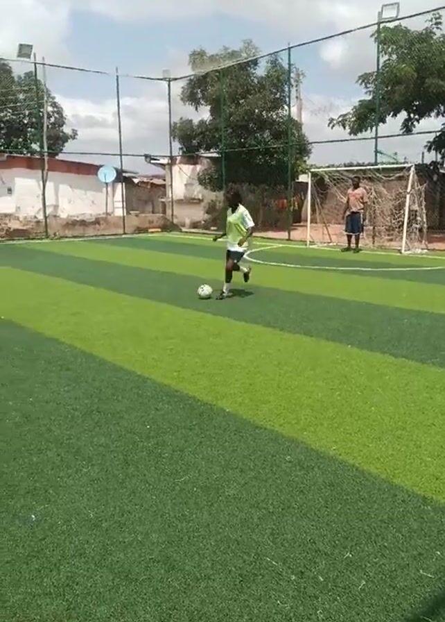 The video depicts a group of people playing soccer on a green and white striped artificial turf field enclosed by a net and fencing