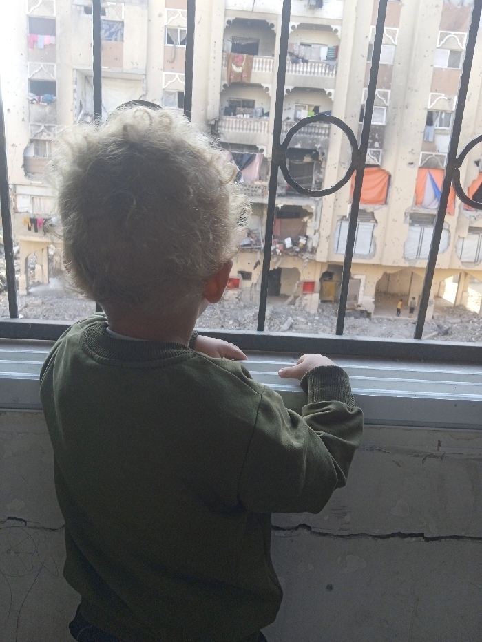 A young child, seen from behind, with light curly hair and wearing a dark olive green long-sleeved shirt, stands at a window, resting hands on the sill. A dark cap is visible on the child's head. Dark metal security bars with circular decorative elements obstruct parts of the window view. The wall beneath the window sill shows prominent horizontal cracks. Through the window, a severely damaged urban environment in Khan Yunis, Palestinian Territory, is visible. Multiple light-colored, multi-story residential buildings stand opposite, exhibiting extensive structural damage, including large sections of walls missing, exposed interiors, and numerous pockmarks across their facades. Debris and rubble are strewn across the ground between the structures. Colorful fabrics, including an orange sheet and a blue and white tarp, are visible within openings of the damaged buildings. In the distant background, two small figures are discernible on the ground level amidst the rubble.