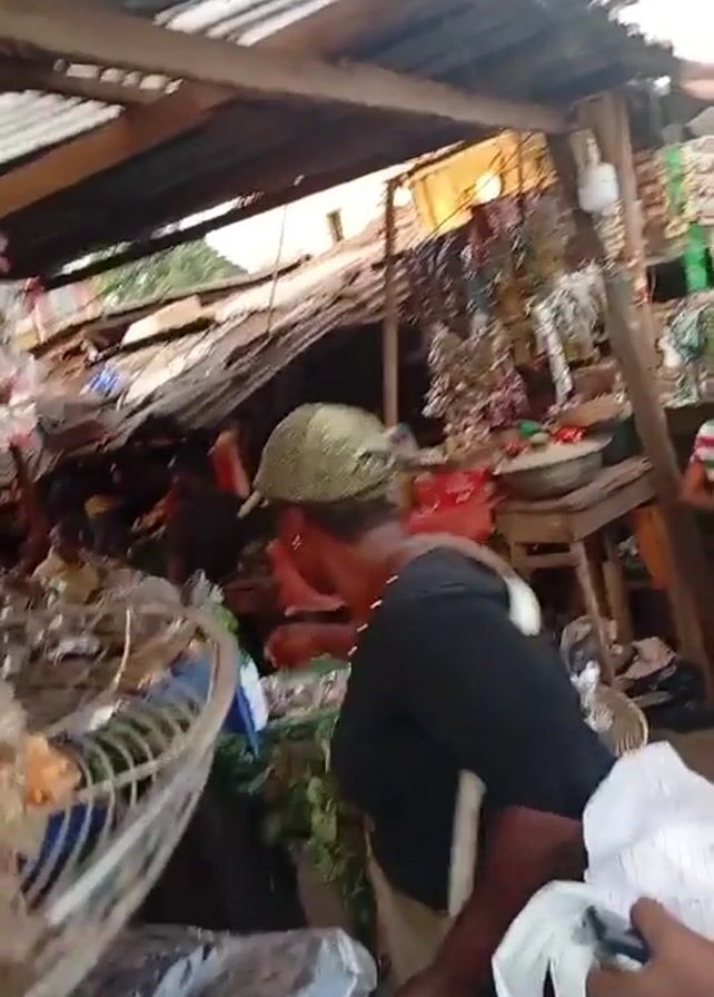 n outdoor market scene. A woman in a black shirt and a green and tan speckled baseball cap bends over a display of produce. To her right is another woman with braids wearing a brown patterned shirt. She is holding a white cloth or bag. The market stall behind them is covered with a corrugated metal roof. Other vendors and customers are visible in the background. The scene appears crowded and busy.
