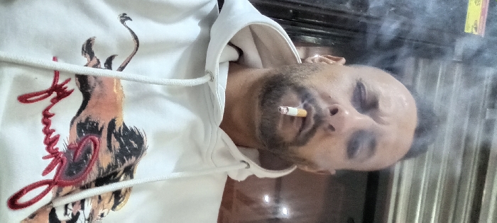 The image displays a close-up portrait of an adult male in Meknes, Morocco. The subject has dark, short hair styled upward and a full beard. Perspiration is visible on his forehead. His eyes are closed or heavily lidded, and his brow is furrowed. A lit cigarette is held between his lips, with smoke actively rising around his head, notably to the left of the frame. He is wearing a white hooded sweatshirt (hoodie) that features a graphic print of a stylized, leaping wild cat, depicted in orange, black, and brown tones. Below this graphic, red cursive embroidery is partially visible. The background is dark and out of focus, showing vertical dark lines and faint, blurry light reflections, consistent with an interior setting or a dimly lit exterior.