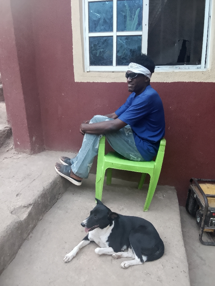 A man wearing sunglasses and a bandana sits on a lime green chair next to a maroon wall with a window. He wears a blue t-shirt and jeans with star patterns. A black and white dog lies on the ground near the chair. A set of concrete steps are seen to the left, while a small generator sits to the right of the chair.