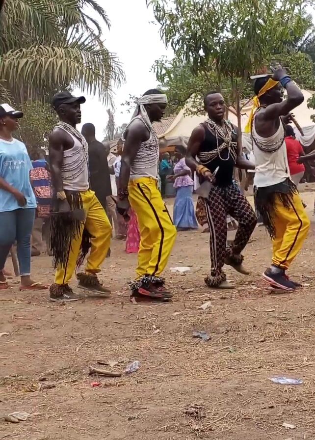 group of men in yellow pants, white tank tops, and beaded necklaces dancing in a dusty outdoor setting