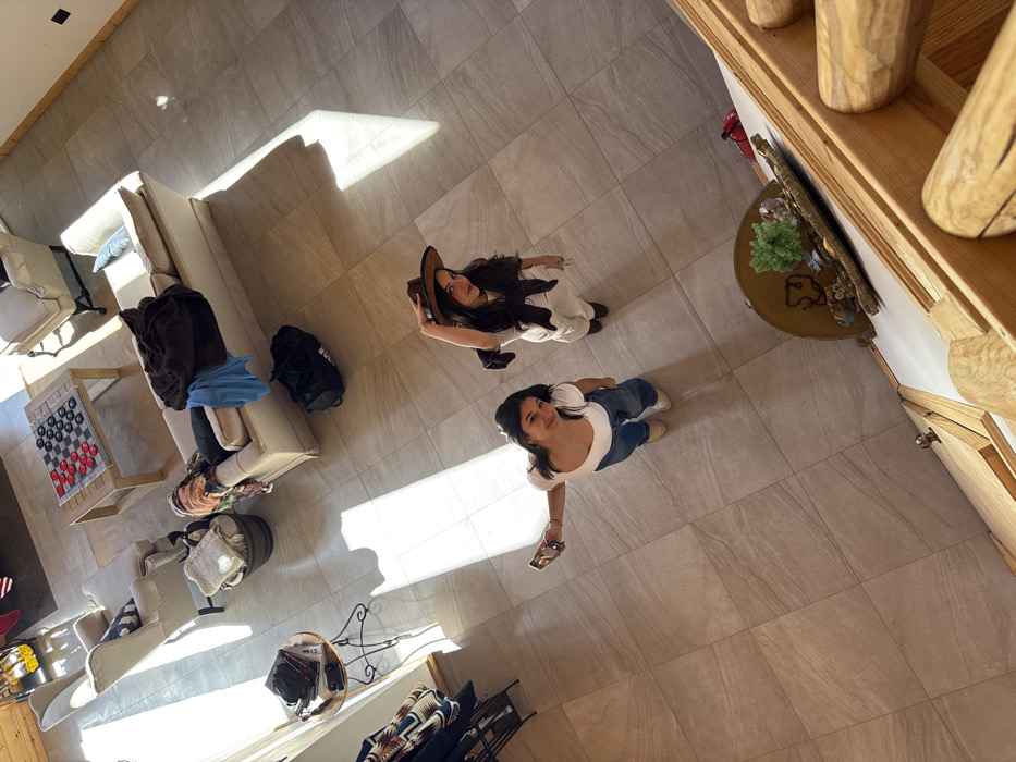 From an overhead perspective, two young women pose on a tiled floor. One wears a brown hat and white outfit, lying with arms outstretched. The other, in a white top and blue jeans, stands holding a phone. Adjacent is a light-colored sofa with a blue blanket, brown jacket, and black backpack. Further along are chairs, a checkerboard table, and additional furniture. Along the upper right edge is a built-in wooden shelf with decorative logs and a round table with a miniature plant.
