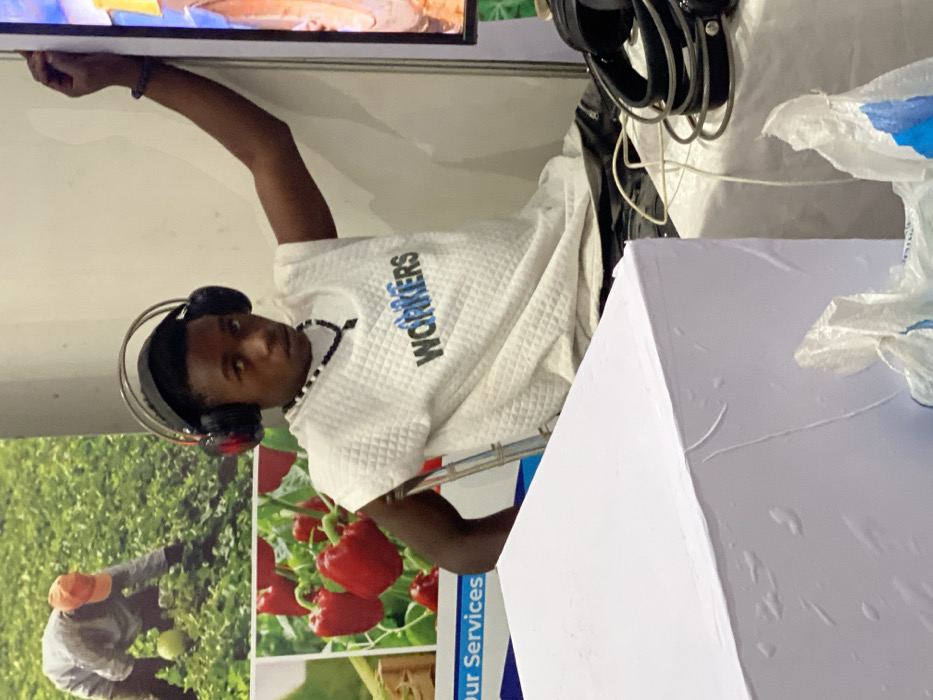 In Unguwar Sarki, Nigeria, an indoor scene depicts a youthful male individual seated in a public or commercial exhibition environment. The individual, with dark skin and short dark hair, wears black over-ear headphones with red accents. He is dressed in a white, sleeveless, quilted-pattern top bearing the blue text "WORKERS" on the chest, dark shorts or trousers, and a black beaded necklace with a small pendant. His right arm is raised and bent, resting against a vertical display panel on the right side of the frame. He looks directly forward. In the foreground to the left, a large white cuboid object, possibly a display stand, is partially visible, showing some surface irregularities. The background features a large poster or banner with agricultural imagery: an individual harvesting a crop in a green field at the top, and red bell peppers on plants at the bottom. A blue banner strip below the peppers partly reads "Our Services." To the right, on a white cloth-draped surface, black cables and crumpled white plastic bags with blue markings are present. The scene is illuminated by artificial light.