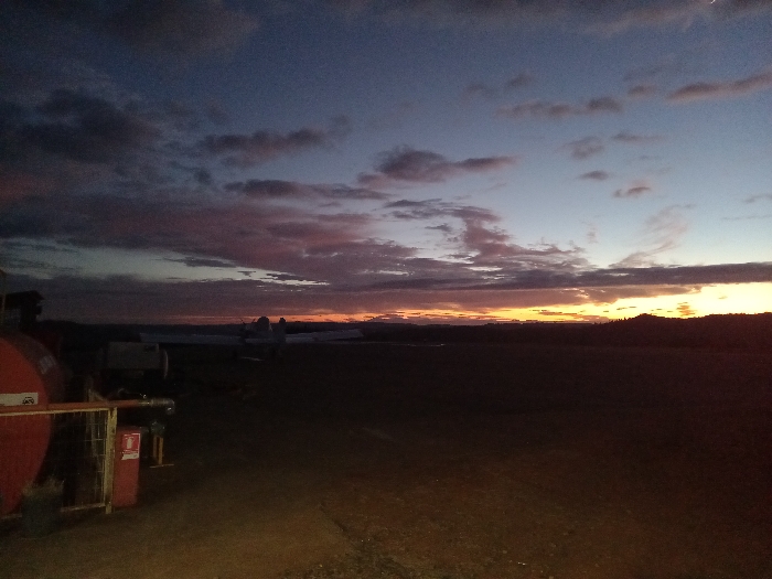 The image captures an airfield or private airstrip in Santa Juana, Chile, during a twilight period, evidenced by the low light and sky coloration